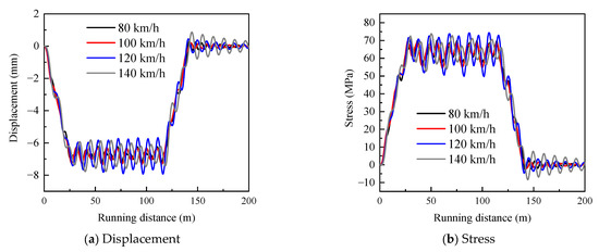 Under different vehicle speeds, the vertical displacement in the middle of the bridge span and the stress ergodic curve of the bottom longitudinal reinforcement of the 30 m-span bridge are calculated, as shown in Figure 5, where the abscissa represents the distance that the vehicle’s first wheel set passes through the left end of the bridge.