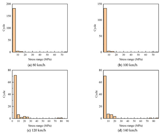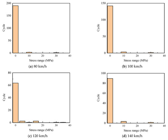 The rain-flow counting approach can be used to calculate the stress amplitude and number of cycles after obtaining the reinforcement’s stress ergodic curve. The stress amplitude and number of cycles of the 30 m-span bridge are shown in Figure 7. The stress amplitude with the greatest number of cycles is found to be within 10 MPa at various vehicle speeds. The number of cycles of the stress amplitude above 10 MPa grows when the vehicle speed exceeds 100 km/h, whereas the number of cycles of the stress amplitude within 10 MPa decreases. There is no stress amplitude of 30 MPa to 65 MPa under varied vehicle speeds, and the number of cycles of stress amplitude greater than 30 MPa is less. This feature can also be found from the stress ergodic curve in Figure 5b.