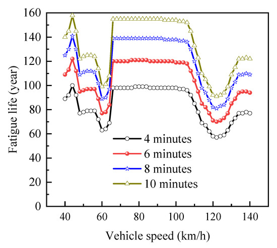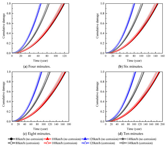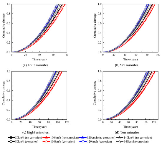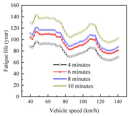 The need to consider the environmental corrosion of the structure in the analysis of bridge fatigue life can be seen in Section 4.3. Furthermore, there is no clear law governing the effect of speed on the cumulative damage curve. The bridge fatigue life is calculated under different vehicle speeds and different train operation intervals in order to more systematically analyze the impact of vehicle operation speed on bridge fatigue life. The vehicle intervals are 4, 6, 8, and 10 min, respectively; the calculated train speed range is 40 km/h to 140 km/h, and the calculation is made once every 2 km/h.