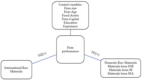 According to Giljum et al. [40], most operating enterprises in industrialized countries are based on raw materials imported from other regions instead of local ones because of the limitation of the source of raw materials and the exploitation ability. Likewise, this propensity is also fortified by Burger [41], who stated that the input of international raw materials might boost the competitiveness and position of the firm as well in the long run. Since the restrictions, regulations, and environmental certificates are required, enterprises may seek international raw materials to meet manufacturing demand. A previous study also indicated that raw materials such as minerals suffer from political issues, inadequate quantifications, and country conditions [2]. Thus, international raw materials offer an important role in the development of firms. Although most domestic raw materials are considered by firms, importing materials acts as an advantage for firms to surpass others in bitter competition [10]. However, there is still a wide range of barriers when a firm desires to access international raw materials: regulations, exchange rate, quality, delivery cost, and delays [10]. Moreover, in the study of Georgise et al. [10], they also claim that, to meet the requirement of importing raw materials from other countries, companies also need to improve their relationship first and distinguish the way of approaching international partners to ensure the stability of transaction, as well as input, in the long-term. Hence, because of the effect of importing materials mentioned above, we also test the influence on SMEs in this study (Figure 1).