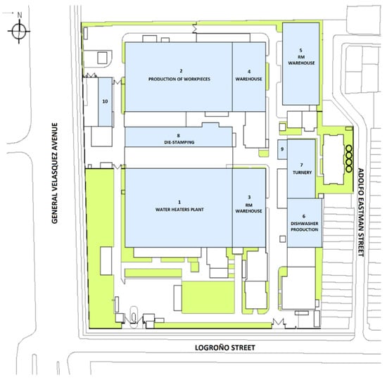 In Figure 3, the colors represent: The green color is used for transit of people, light blue is for closed work spaces, and white color is for truck, crane traffic and other vehicules. Section 9 corresponds to the tooling area and section 10 to the administrative staff offices. As shown in Figure 3, the factory located at the intersection of Adolfo Eastman and Logroño streets is a large production plant with different processes running simultaneously for the manufacture of water heaters, where sinks and spare parts are also manufactured for sale. These areas include have the finished product warehouse which is a fundamental pillar in the production of all items in the factory. The following flow chart shows the role of this area within the plant.