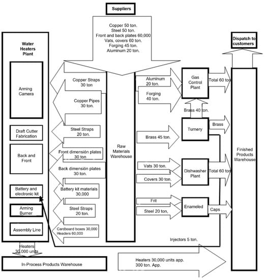 The flow chart in Figure 4 shows all the flows of materials, finished products and products in process in one month, measured in tons. Given the distribution of these flows, we can corroborate the previous premise, where the warehouses of both finished products and finished products are fundamental pillars of production. In this case, we will analyze the finished product warehouse specifically, which is where the greatest movement of the company takes place, given the different models with their respective capacities for sale and the company’s demand.