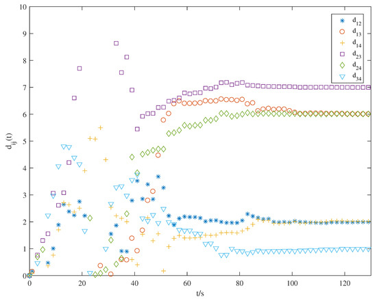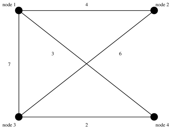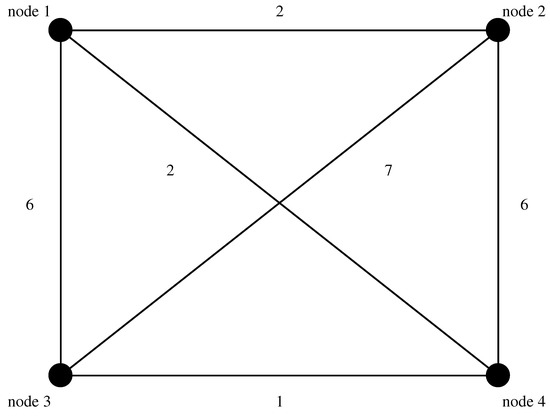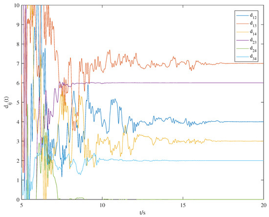 In this example, we consider the continuous case and suppose , such that . The chaotic Chen oscillator is taken to simulate each node of the network: for , . The unknown outer coupling matrix C is preset to , , , , , . The topology structure is shown in Figure 1. According to Remark 1, we have . Therefore, the conditions in Theorem 1 can be satisfied when . Figure 2 shows the results of our simulation when . As can be seen, the estimated value continuously approaches the preset value without additional control. The network topology is successfully identified.