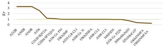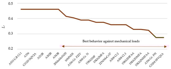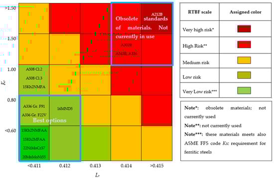 - The matrix representation shows the RIL of the best options of analyzed materials (according to obtained Kr and Lr values), allowing to extract conclusions such as the materials with lower RIL (very low risk) correspond to the most consolidated standards (15Kh2NMFAA, 15Kh2MFAA, 22NiMoCr37 and 20MnMoNi55) followed by other consolidated and new standards (A508 Cl.2, A508 Cl.3, 16MND5 and A336 Gr. F22V). These forging materials are consolidated grades used in the PWR 3-4 generation and, therefore, are currently still in operation. In addition, other historical forging grades such as 16MND5 show very safe conditions.