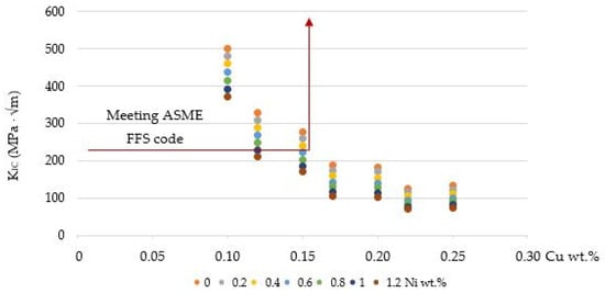 - It has been concluded that, according to the methodology, to keep KIC > 220 MPa · √m as required by ASME FFS code [52], Cu wt% should be lower than 0.15 and Ni wt% lower than 0.60; these limits are more stringent than predictions based on other models: Cu ≤ 0.16, ∀ 0.4 < Ni ≤ 0.6 ∀P according to R.G. 1.99 Rev.2 [53]; Cu ≤ 0.15, ∀ Ni < 0.6 and P < 0.02 according to NUREG CR 6551 [40] and Cu ≤ 0.15, ∀ 0.2 ≤ Ni < 1.2 and p < 0.02 according to ASTM E900-02 [41].