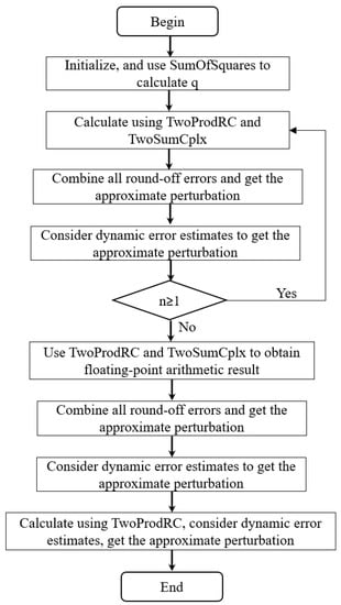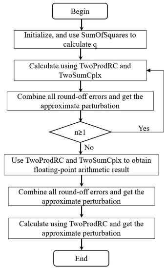 can find the approximate round-off error of q. Other round-off errors in Algorithm 1 can be accurately computed by error-free transformation algorithms and . Then, we can combine all round-off errors by and find the approximate perturbation of for in each loop. The loop ends using and to calculate and combines all round-off errors to obtain the approximate perturbation. The round-off error of should also be considered by . The compensated Goertzel algorithm is presented in Algorithm 4, and Figure 1 shows the flow chart of this algorithm.