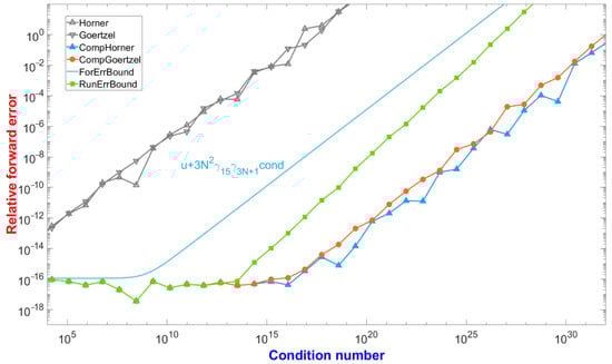 where . The nested-type algorithms are usually used to evaluate polynomials. The Horner algorithm is the most widely used polynomial evaluation algorithm [1]. In special cases, like and , the Goertzel algorithm that can be applied to compute the discrete Fourier transform (DFT) of specific indices in a vector [2,3] is less expensive the Horner algorithm. The numerical stability of the Horner and Goertzel algorithms was given by Wilkinson [4] and Smoktunowicz [5]. The computed results from these algorithms are arbitrarily less accurate than the working precision u when the polynomial is ill-conditioned due to the round-off errors in floating-point arithmetic. The relative accuracy of these algorithms verifies the following priori bound: