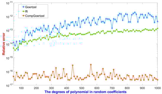 The test environment in this part was the same as the accuracy measurements. We considered the polynomial in Equation (1) with and . Then, the DFT, which could be computed by the function “fft” with the polynomial’s coefficients in MATLAB returned for . The algorithm can also compute the DFT with the polynomial’s coefficients of specific indices in a vector. Figure 4 shows the relative errors of , , and applied to polynomials whose degrees varied from 50 to 1000 by a step of 10 with random coefficients in the interval , where the relative error was defined as . In Figure 4, although was more accurate than , the relative errors of and were all increasing, while the degree of the polynomial grew. However, always obtained full-precision accurate results in this test, and the relative error of our algorithm was to , while the was from to .