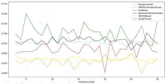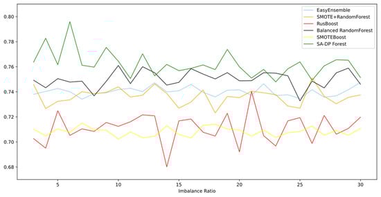 Figure 3 and Figure 4 show the G-mean and AUC of the models according to different imbalance ratios, respectively. There were five comparative methods included in this experiment, for they are all imbalanced learning techniques. Five of them were affected by the increase in the imbalanced ratio to a greater or lesser degree, but the curve did not show a notable decline in either measure—G-mean or AUC. SA-DP Forest achieved the highest performance and remained in first place as the imbalanced ratio increased. The figures of both G-mean and AUC indicate that SA-DP Forest maintained its accuracy and robustness simultaneously, even with less training information of the minority class being provided. We suppose that this depends on the self-optimization technique we used and the artificial samples we generated. The BalancedRandomForest and EasyEnsemble methods were obviously higher than the RUSBoost and SMOTEBoost algorithms, according to both metrics. These four algorithms, the strategies of which are based on ensemble modeling, achieved a higher G-mean than SMOTE+RandomForest. In Figure 4 (AUC), it can be seen that SMOTE + RandomForest achieved a higher result than RUSBoost and SMOTEBoost. Compared with basic ensemble learning algorithms, these sampling techniques applied in the stage of data pre-processing before ensemble modeling did improve the classification ability on the minority class, according to the figure.
