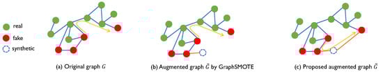 Recall that in Section 2.2, we introduce GNNs for node classification tasks. Given a graph , where is a set of n nodes; is an adjacency matrix, and denotes a feature matrix: let denote the label information. The aim of a typical node classification task is to learn a node classifier f; that is, . However, if we assume that the C classes have a varied number of nodes, the typical node classifier f will perform poorly. Following GraphSMOTE [], we define the class imbalance ratio (IR) as the ratio of the smallest minority class to the largest majority class in the graph. As shown in Figure 1a, the original graph has the class imbalance problem. The number of fake users is obviously smaller than the number of real users.