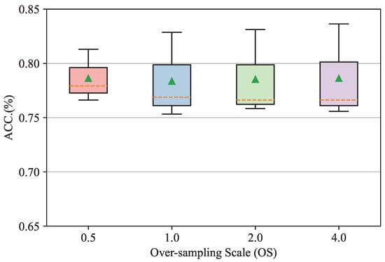 The oversampling scale determines the number of augmented minority class samples and thus is always considered a key factor affecting the performance of class-imbalanced node classification tasks. In this subsection, we conduct sensitivity experiments to evaluate the proposed method with different numbers of oversampling samples to explore the effects of oversampling scales. This experiment is conducted in a well-constrained setting on Cora by varying the oversampling scales at 0.5, 1.0, 2.0, and 4.0 under an IR of 0.5; all other settings are fixed. Per the implementation (https://github.com/TianxiangZhao/GraphSmote (accessed on 20 May 2022)) in related work [], the oversampling scale refers here to the ratio of the number of augmented samples from the minority class to the number of original samples from the minority class. The smaller the IR, the smaller the number of augmented samples in the minority class. Experimental results are reported in Figure 2. The whiskers of boxplots are the range of accuracies over three-time experiments, and the line (green markers) inside the boxplots denotes the medium (mean) value of classification accuracies. Figure 3 illustrates that as the oversampling scales increase, the highest accuracies under the corresponding oversampling scale rise consistently, although the average accuracy expectancy does not show a significant difference. We assume that this phenomenon may have occurred given the limited number of minority class samples. Oversampling enamors augmented samples can help the model learn the patterns of minority classes and debiasing but raises the risk of overfitting on limited patterns of minority class samples. The overfitted models therefore have a residual effect on the average accuracy expectancy.