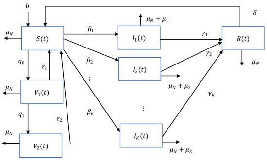 We consider a multi-strain SIR model as shown in (1). We assume that there are types of strain and only one single vaccine available. The model includes susceptible population (), the number of individuals who received only one dose of the vaccine (), the number of individuals who received two doses of the vaccine (), the number of people infected by the kth strain (), and the number of individuals who were recovered (). We assume that each susceptible person is infected with at most a single strain at a time. We present their relationship between the compartments in Figure 1, and introduce the following proposed model