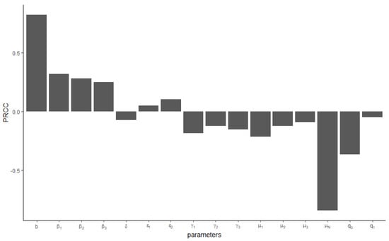 Sensitivity analysis can be used to explore the effect on outcomes due to the changes in each parameter within a specified range in a mathematical model. In the studies of [26,27], the LHS/PRCC (Latin hypercube sampling/partial rank correlation coefficients) technique was used to analyze the sensitivity of parameters in . In this subsection, we use the same technique to find the parameters that have more influence on .