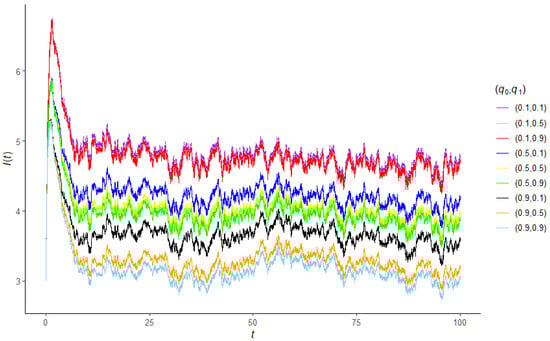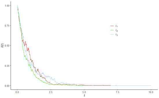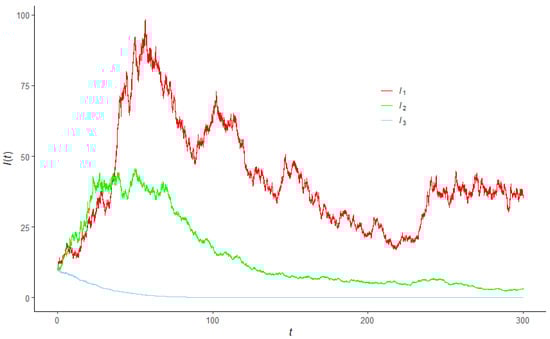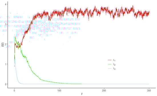 From Theorem 4, the value of should oscillate in the interval if is large enough. That is, some strains will persist, and after a certain period of time , the average number of infected people will stay in this interval. We next discuss the conditions for the extinction or existence of the strains. Define