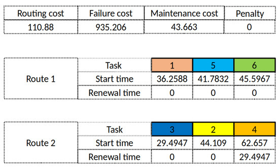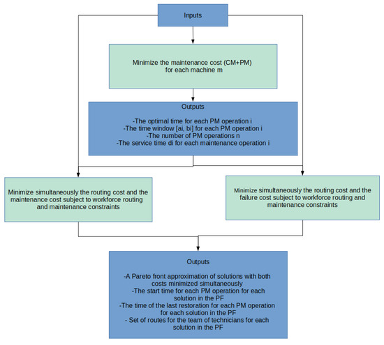 The maintenance model is solved to determine the optimal time for each maintenance operation i that minimizes the total maintenance cost. The optimal date to perform a PM operation i is used to determine the durations for the PM operations, the total number of operations n and a time window interval [, ] that minimizes the total maintenance cost. The above steps have been adopted by Lopez-Santana et al. [4]. We then solve the defined joint maintenance and routing model that minimizes the routing and the maintenance costs or the routing and the failure costs. Penalties for late arrival are considered in both cases. In the first case, the maintenance cost is minimized considering the workforce routing constraints that incorporate maintenance requirements (maintenance time windows, etc.). Integrating technical maintenance requirements with transport management is the first merit of the approach. In the second case, the failure cost is minimized to reduce the risk of failures. However, the optimal time chosen must be within a time window that minimizes the total maintenance cost. This latter case considers three objective requirements simultaneously while the minimization of maintenance cost is included in time windows constraints. Expressing some objectives of optimization problems as constraints reduces the problem complexity as adopted in [14]. The second merit of our approach is integrating several maintenance strategies. Indeed, the chosen optimal time reduces the risk of failures, the maintenance cost, and the travel cost (risk-based maintenance, etc.). The outputs of the problem are shown in Figure 1. The workforce routing constraints influence the time to perform maintenance operations, the time of the last restoration that depends on that latter in the combined model, and the waiting time. All the variables are interconnected. Therefore, it is essential to model an integrated problem and to solve it using multi-objective optimization.