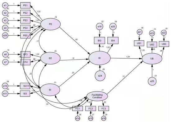 The hypothesis testing results in Table 7 show that out of five hypotheses, four had a significant relationship while H2 (EE to BI) was insignificant. The results prove that PE and SI influence teachers’ intention to use digital textbooks, while BI and FC directly affect UB. Furthermore, as shown in Figure 3 and Table 7, PE most significantly influences BI to use digital textbooks in mathematics lessons.
