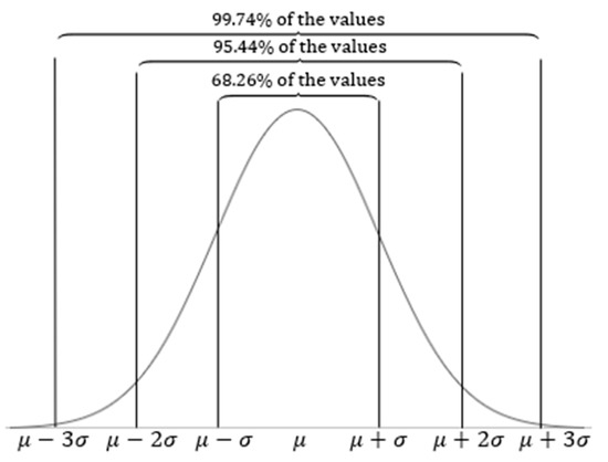 sample’s EDF (I is the event indicator; it is equal to 1 if the argument event is the realized one and 0 otherwise). Normal distribution variates are distributed by the 3σ rule, hence the sample elements will be approximately distributed by it. The 3σ rule is interpretable as per Figure 1.