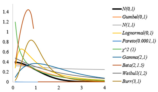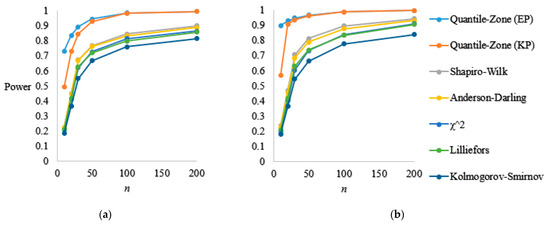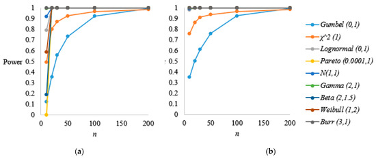 In this section, we offer power analysis results obtained through Monte Carlo simulations of the distribution of statistic with 10,000 runs (samples) for various sample sizes and alternative distributions. The null distribution is . Simulations are performed using MATLAB with the random number generation algorithms and modeling methods implemented in it. Many of the distributions can be modeled in MATLAB with the special command (“normrnd”, “chi2rnd”, “betarnd” etc.), however, not all the distributions are available [32]. In that case, we used the inverse function method [21,22,31].