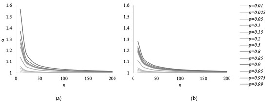 Statistic values for various sample sizes and probabilities : (a) Parameters and are known; (b) Parameters and are estimated with and , respectively.