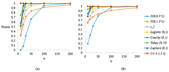 Empirical power of statistic for various sample sizes with the level of significance —Symmetric alternative distributions: (a) Parameters and are known; (b) Parameters and are estimated with and , respectively.