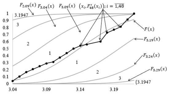 Even though here the EDF is essentially located well, the normality of distribution is not confirmed. That is due to , i.e., 8.3% of the sample elements equals 3.22, which does not satisfy the basic normality properties.