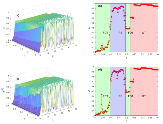 where represents the coupling strength, is a chaotic mapping. Based on chaotic dynamics theory, we know that when takes different parameters, the coupled system (11) will produce rich dynamic behaviors such as fully developed turbulence (FDT) state, pattern selection (PS) state or different forms of spatio-temporal intermittency (STI) state [38]. At first, let , coupling strength , Take the initial value for , to reduce the calculation time, each time sequence length is set as 50, and the evolution image data is shown in Figure 3a. Then we build a time-varying multilayer RN with embedding parameter , and obtain the evolution of the index with the coupling strength , as shown in Figure 3b. In order to further check the stability of , noise interference is added to the coupling system. A noise sequence with SNR = 70 dB is added to the first sequence , and the new data evolution image was obtained as shown in Figure 3c. At this time, Figure 3d show the evolution result of the corresponding index with the coupling strength .