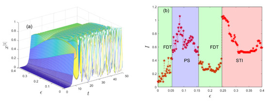 To verify the effectiveness of indicator , the initial value of CML of the coupling system was set as [0.00001562, 0.00005104, 0.00009650, 0.00007028, 0.00004737], and the evolution image of the obtained data is shown in Figure 4a. The calculated evolution image of indicator with coupling strength is shown in Figure 4b.