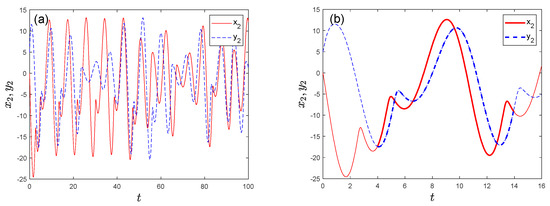 In this coupling system, variables and are coupled with each other. We take parameters , and the simulation step size . The obtained evolution images of variables and is shown in Figure 5a. To reduce the influence of initial values, we take the data of and in the interval as sample data, as shown in Figure 5b. From the selected time period, the change of variable lead that of variable . Indexes of mutual leading relationship between systems and are calculated as shown in Figure 5c,d respectively.