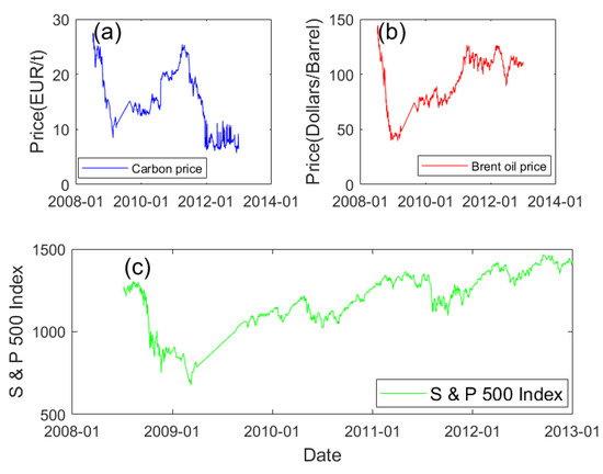 In Phase I, price data of EU carbon market, Brent crude oil price data of energy market and S&P 500 data of financial market are drawn in Figure 6a–c respectively.