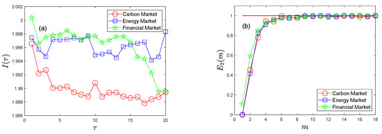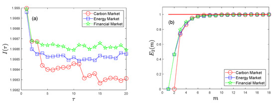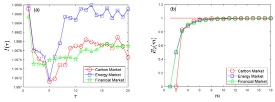 For the sample data in Phase-I, we used the mutual information method to obtain the evolution image of the mutual information index among the three markets at any time lag , as shown in Figure 7a. Thus, in Phase-I, the optimal delay of phase space reconstruction of EU carbon price data is , that of Brent crude oil price data of energy market is and that of S&P 500 data of financial market is . On this basis, we used Cao method to confirm the embedding dimension. The image of changing with embedding dimension is plotted in Figure 7b. We can see that values of the three markets tend to be stable when , so the embedding dimension is .