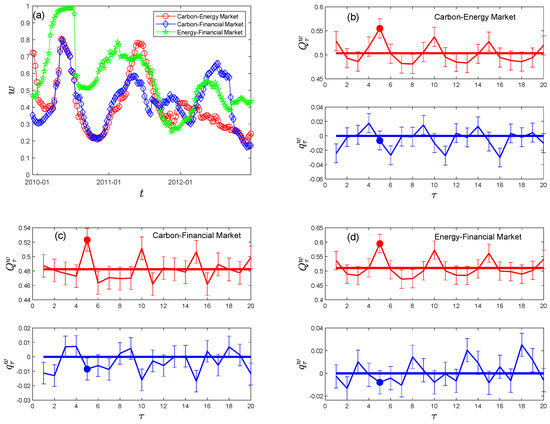 As can be seen from Figure 8a, in phase-I, the evolution trend of the cross-correlation index of carbon-energy and carbon-financial was almost the same before 2011, and their values reached the lowest point in early 2011. We find that this is caused by the European debt crisis. From 2010 to 2011, the credit crunch reduced the output of the energy industry, and the returns spillover from financial assets to the carbon market stopped previous upward trend, thus reducing the mutual correlation of carbon-energy and carbon-financial [21,28]. From the perspective of the mean value, before 2011, the mean values of the carbon-energy and carbon-financial mutual correlation index were both small, 0.4161 and 0.4330 respectively, while the value of the energy-financial market mutual correlation index was relatively large, with an average value of 0.5711, indicating that the energy-financial market system is more closely related than the carbon-energy market system and the carbon-financial market system at this stage. Overall, before 2011, the value of energy-financial is much higher than that of carbon-energy and carbon-financial, but 2011 years later, there is no significant difference in the strength of the linkage relationship among the three markets. The interaction between them is relatively small, which may be due to the immature working mechanism at the beginning of the second phase of the carbon market operation. Therefore, the carbon market is less relevant to the other two than the energy market is to the financial market. Later in the second phase, with its continuous development, the carbon market gradually integrates into the market system composed of energy and financial markets, and can effectively accept the fluctuation signals from other markets and change accordingly. We can see from Figure 8b–d that in the second phase of EU carbon market, the metric index of the mutual guiding relationship of carbon-energy market reaches its maximum value at , while at this time. This shows that the trend of Brent crude oil price led the carbon price, that is, the energy market led the carbon market at this phase. The metric index of the mutual guiding relationship of carbon-financial market reaches its maximum value at , while at this time. This indicates that the trend of S&P 500 price led the carbon price, that is, the financial market led the carbon market at this stage. The metric index of the mutual guiding relationship between energy market and financial market reaches its maximum value at , while at this time. This indicates that the financial market led the energy market at this phase, and the trend of S&P 500 price led Brent crude oil price.