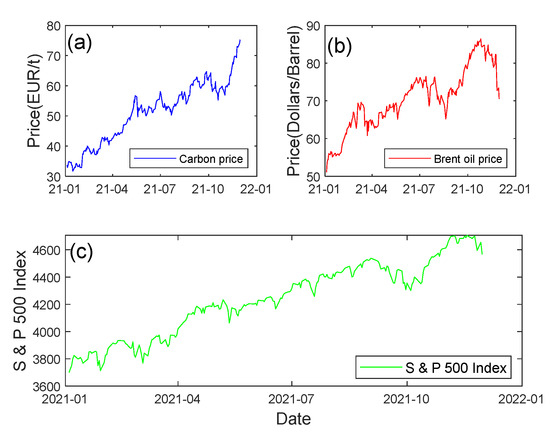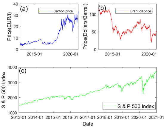 The price data of EU carbon market, Brent crude oil of energy market and S&P 500 of financial market selected in Phase-II are shown in Figure 9a–c respectively.