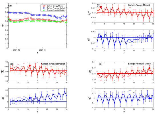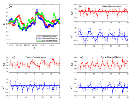 From Figure 14a, we can observe that values of carbon-energy, carbon-financial and energy-financial in phase-III are significantly improved compared with the previous two phases, and the evolution trend is more stable, with the mean values of being 0.6265, 0.7455 and 0.5983 respectively. Among them, the values of carbon-energy and carbon-financial are both greater than the values of energy-financial, indicating that after entering the fourth phase of the EU ETS, the European carbon price has been rising all the way due to tightening of reform quota, which send a good signal to other markets. Carbon market has become a relatively mature market system and gradually plays a dominant role in the world market system. In general, value of carbon-financial is always the highest, showing that the carbon-financial link has been even closer since entering the fourth phase of the EU carbon market. We can see from Figure 14b–d that in Phase-III, the mutual guiding relationship index of carbon-energy market reaches its maximum value at , while at this time. This shows that the trend of carbon price led Brent crude oil price, that is, carbon market led energy market at this phase. The metric index carbon-financial market reaches its maximum value at , while t this time. This shows that the carbon market led the financial market at this phase, that is, the carbon price led the trend of the S&P 500 price. The metric index of energy-financial market reaches its maximum value at , while at this time. This shows that the financial market led the energy market at this phase, that is the trend of S&P 500 price led Brent crude oil price.