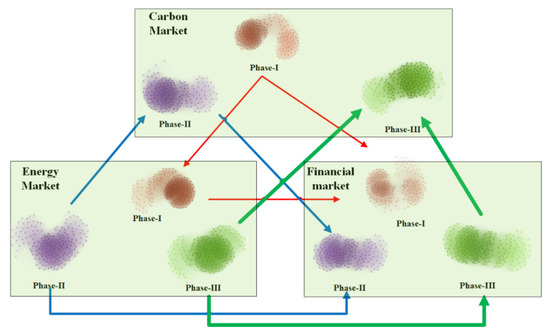 Here we compare the results with those of other relevant studies. Comparing the three phases, we find that the correlation between markets obviously increases with the development of EU carbon market, which is basically consistent with research results under the market system of “carbon-renewable energy-finance-energy” of literature [24]. Our research found that there is information spillover between carbon market, energy market and financial market, and the direction of information spillover changes dynamically with the development of EU carbon market, which is obviously consistent with the results of literature [21]. Tan et al. found in the “carbon-energy-finance” system that the correlation between EUA and energy assets was often higher than that of financial assets. In our research results, the correlation between carbon market and energy market was greater than that of carbon market and financial market in the early phase of Phase-I and Phase II, while it was opposite in the late phase of Phase-I and Phase III. For the former, we consider that the transition period of the carbon market leads to the instability of the connection, while for the latter, we consider that the difference in data selection leads to the instability. But in general, it does not affect the consistency of the core results. Overall, our results are in good agreement with those in the existing literature. Further, compared with previous studies [20,25], based on network topology indicators, we quantify the linkage relationship between the EU carbon market at different phases of development, energy market and financial market, quantitatively measure the position of the three markets in different phases in the whole system, and dynamically evaluate the evolution process of interaction between the three markets.