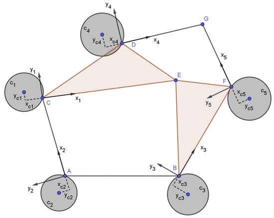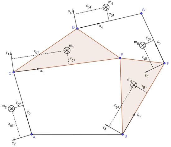 Each of the links has a local coordinate system with its origin located at point i and the x axis directed toward point j. Each of the links has a mass and a center of gravity located at local coordinates (, ) for . The distribution of the points is detailed in Table 1.