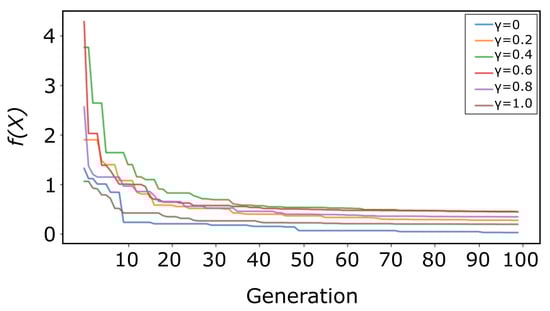 The crossover is performed with a probability . Then, and are evaluated in the function to be optimized. To be considered part of the new generation, the one with the best results is chosen. The generations are repeated 100 times, resulting in the solution exhibiting the lowest value.