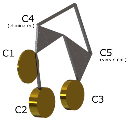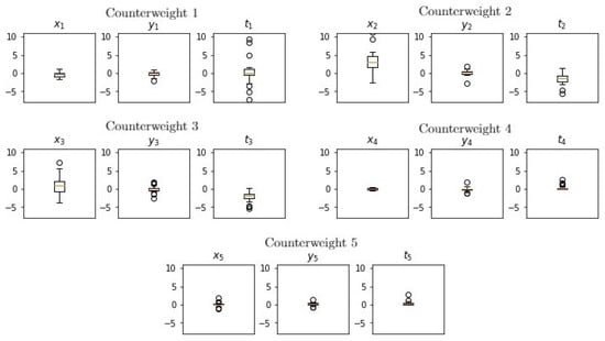 A multiobjective optimization problem emerges as it is desired to minimize both and considering the variables boundaries (i.e., the physical limits for the locations of the CoM ( and ) and the thickness () of each counterweight). To solve this problem, a linear combination of the objectives is performed as proposed in Equation (49).