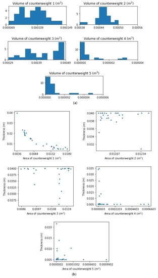 The effectiveness of the analysis of the boundaries by means of box plots of the partial derivatives of the variables to be optimized together with the histograms of volumes and relations between area and thickens were also demonstrated. They ease the visualization of possible improvements on the counterweights and allow us to make useful decisions on their implementation.