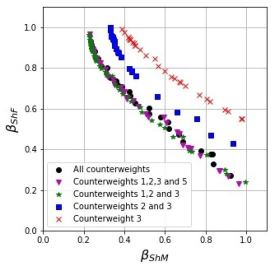 Comparison between Pareto fronts has proven to be a useful tool for better visualizing the impact of each counterweight on the dynamic balancing of the mechanism.