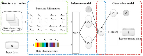 The affinity matrix of structure information can be seen as geometric constraints of the data. As a result, we can reorganize the input data as an objects similarity graph , which includes both the characteristics and structure of the data. In this way, the clustering ensemble task on is transformed into a clustering problem on the reorganized graph . To this end, we develop a joint model within the VGAE framework. In this model, data characteristics and structure information are integrated by learning their joint embeddings in latent space, and, subsequently, a GMM is utilized to predict the final cluster assignments for the latent embeddings.