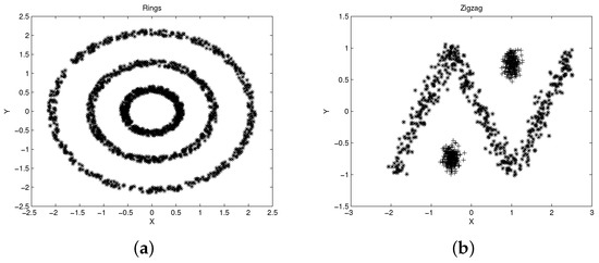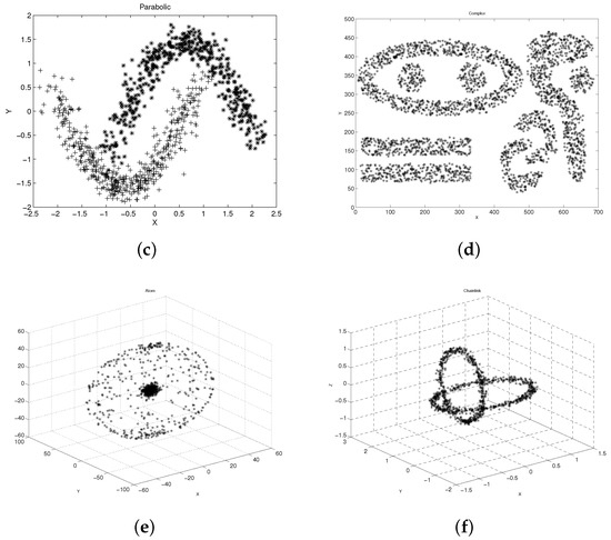 Distributions of synthetic data sets. (a) Rings. (b) Zigzag. (c) Parabolic. (d) Complex. (e) Atom. (f) Chainlink.