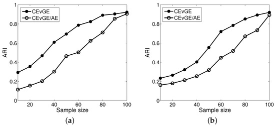 To test the generative ability of the CEvGE framework, we replaced the VAE module in the framework with an AE, and marked this framework as CEvGE/AE. Then, we randomly sampled various proportions (10% to 100%) of objects from KDD’99 and MNIST to construct two new data sets. The clustering results (ARI) of CEvGE and CEvGE/AE performed on these sampled data sets are illustrated in Figure 3. The results show that the performances of these two algorithms reveal a downward trend as the sample size decreases. This finding is largely due to the fact that randomly sampling destroys the intrinsic structure of each category. In particular, under small sample sizes, the sampled objects cannot reflect the original category distributions. It is worth noting that the CEvGE keeps its ARI at a constantly high level, as the sample size is larger than 60%, and it outperforms the comparative algorithm under all of the different sample sizes. The only difference between the proposed algorithm and CEvGE/AE is the generative capacity. Thus, we can conclude that our framework can create some new samples similar to, but not identical to, the input data, and that the generative capacity plays a positive role in the prediction of clustering assignment.