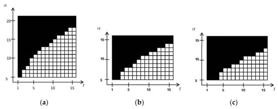 In Figure 3, black color shows the areas of fulfillment of the inequality for with an accuracy of .