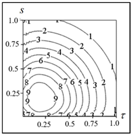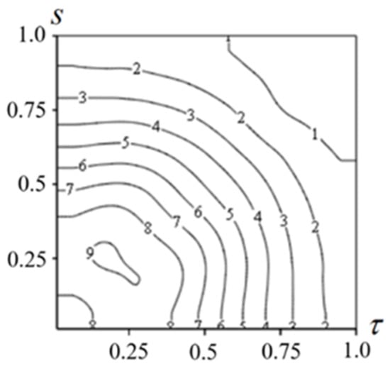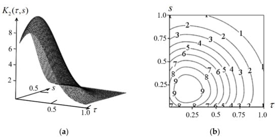 To test the proposed algorithm of identifying quadratic kernel, a numerical experiment was carried out, some of the results of which we present in this paper. The test quadratic kernel is a function used to describe the dynamics of some type of heat exchangers [50]. Figure 4a shows the surface of this function, and Figure 4b shows isolines. The time interval boundary was , while the number of nodes was , .