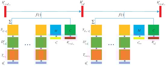 Using Equation (6), we obtain multi-dimension spatial–temporal recurrent neural networks (MST-RNNs). Figure 1 shows the diagram of the proposed MST-RNN model in which different matrices or vectors are represented by different colors. Obviously, considering duration time and semantic tags are significant factors for POI prediction, it is necessary to involve them in our model. Similar to time-specific transition matrices in ST-RNN, we incorporate the spatiotemporal transition matrices and the semantic matrices for different distances between POIs. These transition matrices capture intention properties that affect driver behavior. In MST-RNN, all spatiotemporal information of a user can be obtained by multiplying the transfer matrix. Then, spatiotemporal matrix and semantic matrix are summed and transformed by the function to obtain the hidden vector of the next state.
