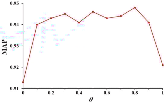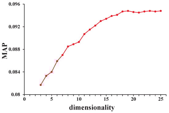 In order to explore the impact of dimensionality on the results and select ideal parameters, we set h, , and study the metrics of the MAP with varying dimensionality. Figure 2 shows a clear result. We can find that the MAP shows an overall upward trend with the increase in dimensionality. However, its rising speed is getting slower and slower. When d takes a value after 20, the value of the MAP basically no longer changes. According to the usual principle, when the performance is basically the same, choose a simpler model. Therefore, we recommend as the most suitable parameter in dimensionality.