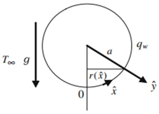 The configuration of viscous and incompressible fluids flowing with natural convection over a cylinder of circular form lying parallel to the x-axis is important for many engineering processes. The applications of these types of processes are geophysical heat elimination, food storage and processing, metallurgy sciences, geothermal removal of nuclear and non-nuclear reactors, and various branches of engineering, such as mechanical, chemical, and civil engineering. The pioneering studies by Blasius et al. [1] discussed the boundary-layer flow over the horizontally placed circular form of a cylinder in 1908. They found the velocity profile and evaluated the momentum transport equation of the forced-convection boundary-layer flow. Since then, these studies have found a new space in the cabinet of many researchers. Later on, Markin et al. [2] were the first who examined the exact solution of a free-convection flow over the isothermal cylinder. Later on, they found the exact solution of the mixed convective flow over an isothermal cylinder with the wall of the cylinder having a fixed temperature with the help of the Gortler–Blasius series expansion along with the finite difference scheme [3]. With the help of Markin et al.’s work, Ingham and Pop [4] made a great contribution in this era. They determined the solution of a free convective flow over an isothermal horizontal cylinder numerically. Recently, Mohamed et al. [5] investigated the viscous-dissipation flow over a horizontal circular cylinder of a nanofluid with free-convection boundary layer.