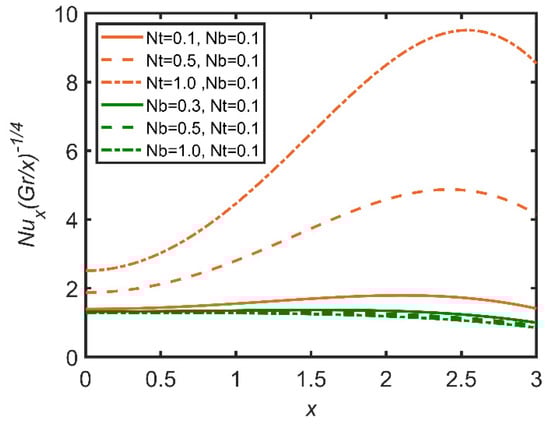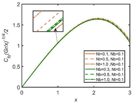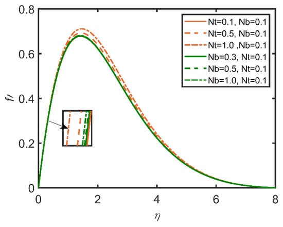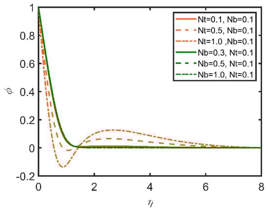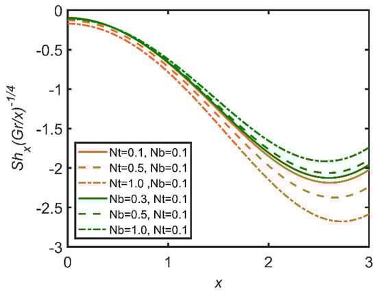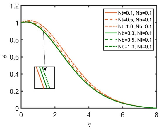 In Figure 3, Figure 4, Figure 5, Figure 6, Figure 7 and Figure 8, the comparisons ofthe thermophoresis parameter and Brownian motion are shown with the help of graphs. It is clear from Figure 3 that with the increases in the thermophoresis parameter (Nt) and Brownian motion (Nb), skin friction increases. The terms of Brownian motion and thermophoresis parameter are inversely related to the viscosity of the fluid. Furthermore, skin friction is related to the friction between the surface and the fluid flow near the surface. So, with the increases in the Brownian motion and thermophoresis viscosity of the fluid and the decrease in the motion of the fluid, skin friction increases as a result. In Figure 4, the Nusselt number is discussed. The Nusselt number is related to the rate of heat transfer of the fluid; moreover, with the increase in thermophoresis, the temperature of the fluid increases, and the fluid easily transfers heat. Therefore, with the increase in the thermophoresis parameter, the Nusselt number increases. Moreover, the Brownian motion parameter (Nb) is related to the concentration of the mass particles. So, with the increase in Brownian motion, the Nusselt number decreases. In Figure 5, the Sherwood number results are reported. The Sherwood number decreases as the thermophoresis number increases; however, for Brownian motion, the Sherwood number increases, as it is related to the mass concentration of the fluid. In Figure 6, the concentration profile results are reported. As the thermophoresis parameter (Nt) and the Brownian motion parameter are enhanced, the concentration profile increases, but the trend becomes opposite when the graph approaches the lowest point.