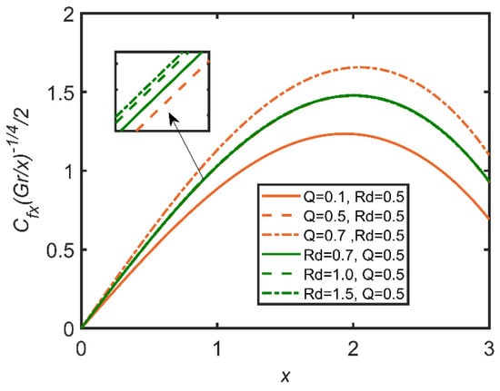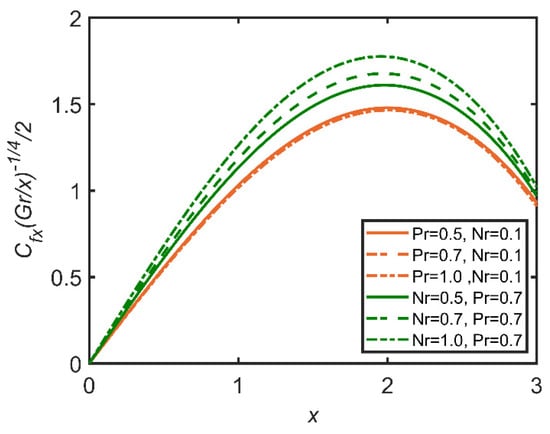 Comparison for skin friction against x.