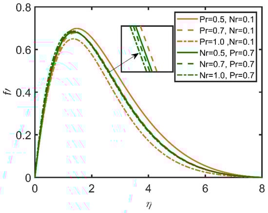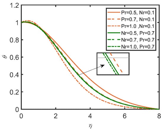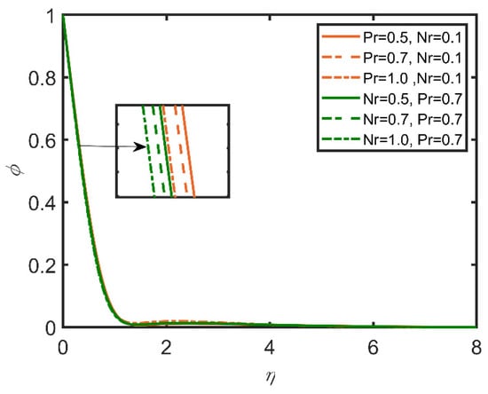In Figure 9, Figure 10, Figure 11, Figure 12, Figure 13 and Figure 14, the comparisons of the buoyancy ratio and the Prandtl number are reported with the help of graphs. In Figure 9, the increase in the buoyancy ratio makes the fluid become less dense and flow easily. Therefore, skin friction increases. However, the Prandtl number decreases, as the Prandtl number is directly related with the viscosity of the fluid. In Figure 11, the Sherwood number increases with the increase in the buoyancy ratio, and as the Prandtl number increases, the Sherwood number decreases. It is due to the increase in the mass flow rate of the concentration of the fluid. In Figure 13, the velocity profile shows that with the increases in the Prandtl number and the buoyancy ratio, the velocity profile becomes smaller. This effect is due to viscosity, which becomes high with the increases in the Prandtl number and the buoyancy ratio. In Figure 14, the temperature profile shows that by increasing the Prandtl number and the buoyancy ratio, we lower the temperature profile; therefore, with the increases in the Prandtl number and the buoyancy ratio, the density of the fluid diminishes.